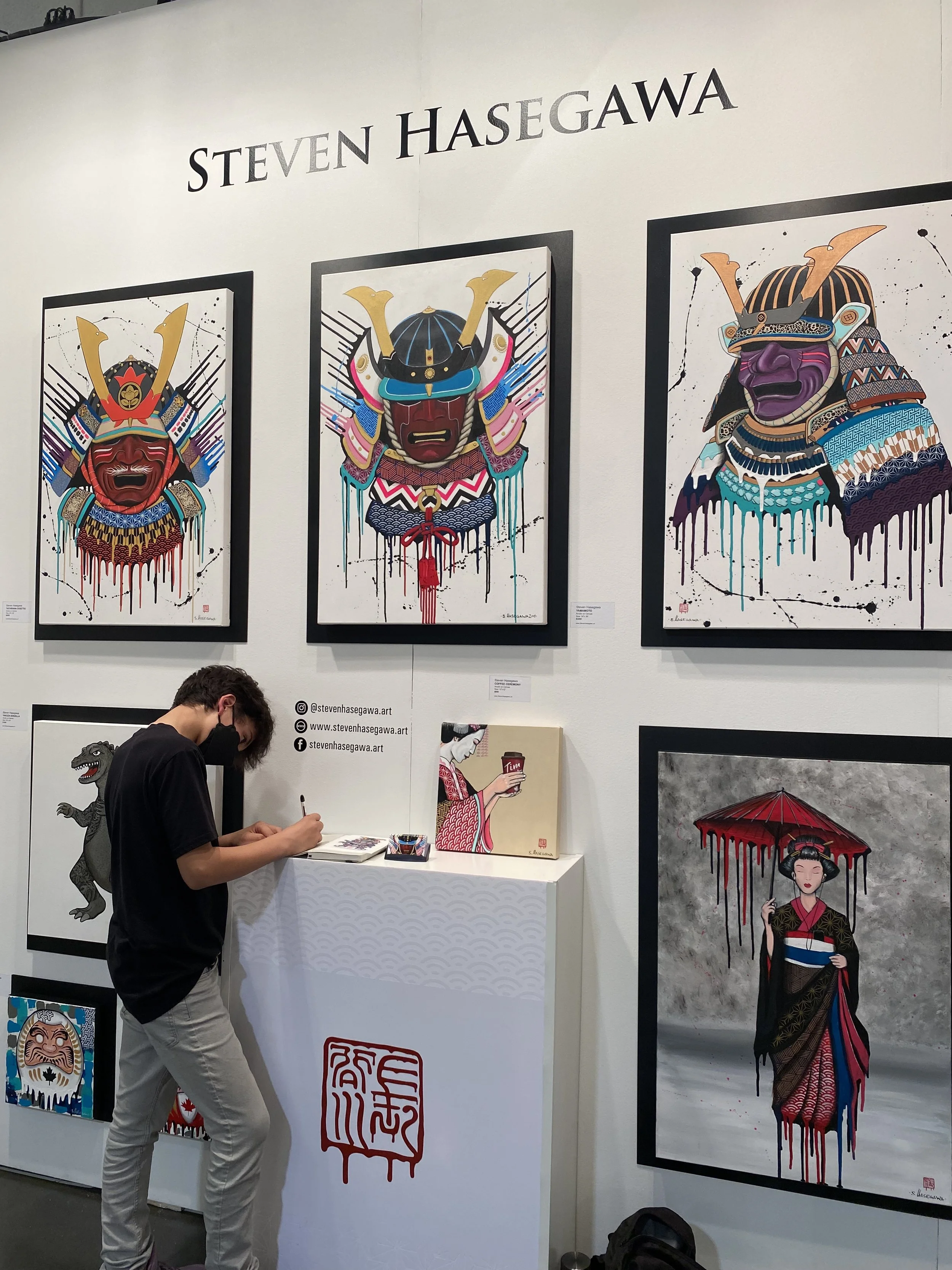 Max returns to one of his favourite artists booths. The last time we met Stephen Hasegawa, Max drew in his log book. Three years later here Max is adding another drawing to Stephens book!